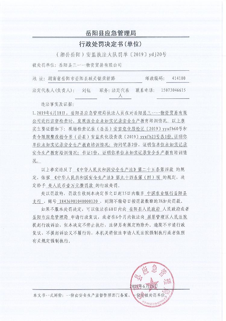行政處罰決定書(湘嶽嶽陽安監執法大隊罰單〔2019 〕ydj20號)