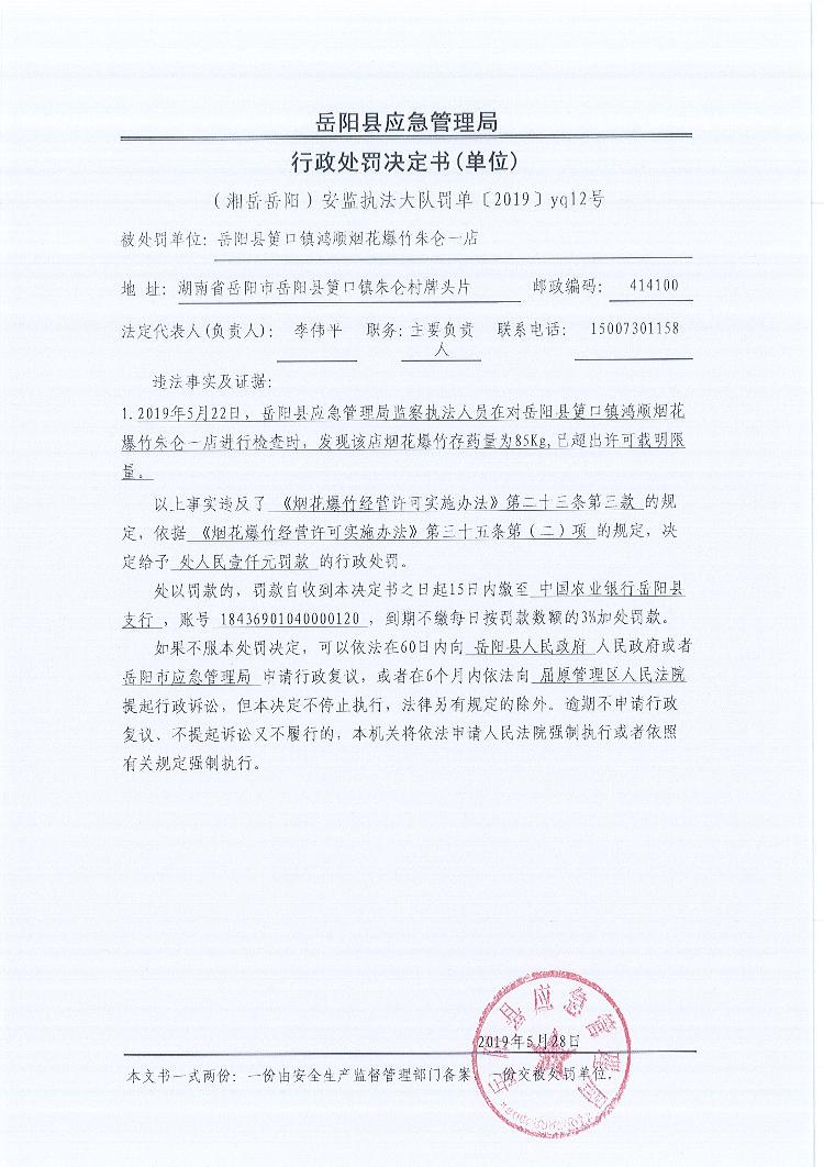 行政處罰決定書(湘嶽嶽陽安監執法大隊罰單〔2019 〕yq12號)