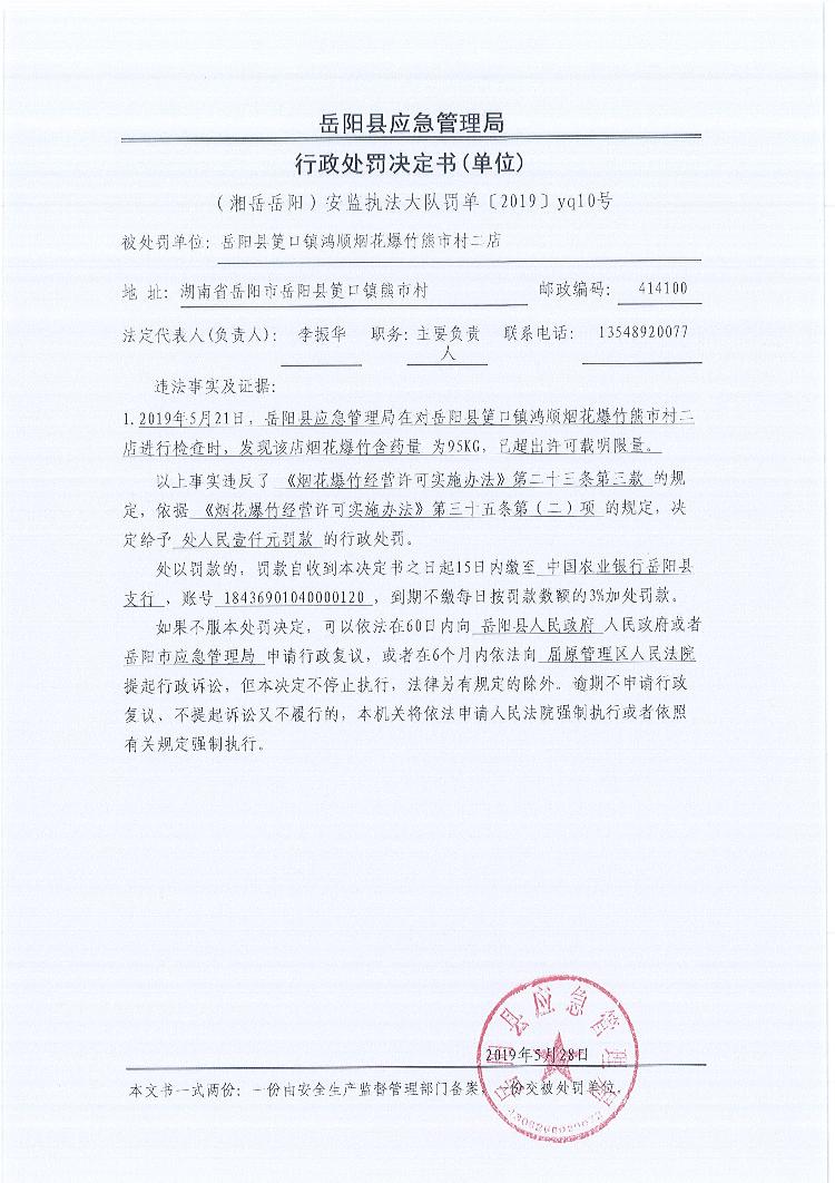 行政處罰決定書(湘嶽嶽陽安監執法大隊罰單〔2019 〕yq10號)