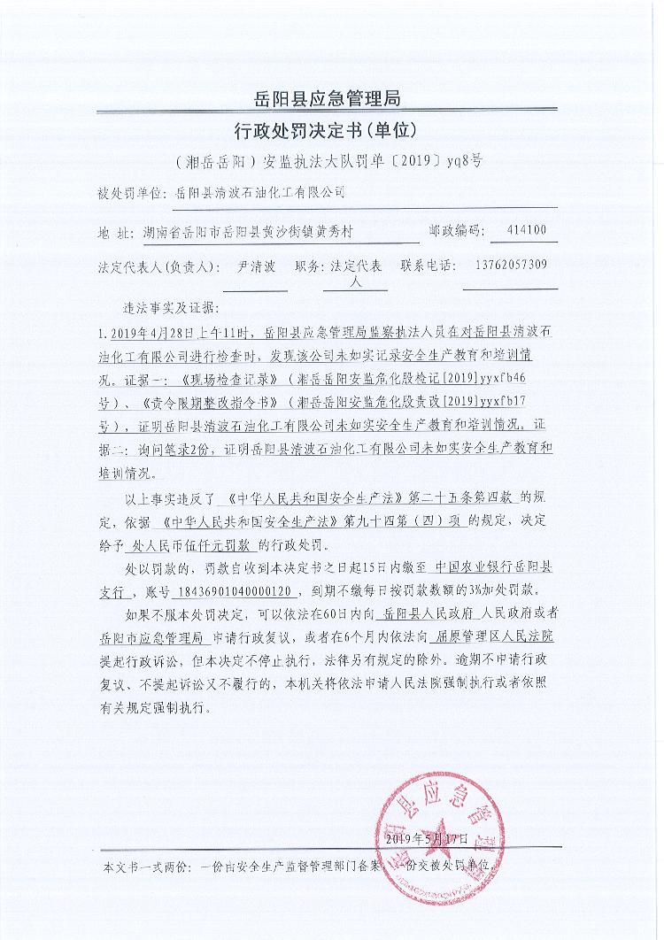 行政處罰決定書(湘嶽嶽陽安監執法大隊罰單〔2019 〕yq8號)