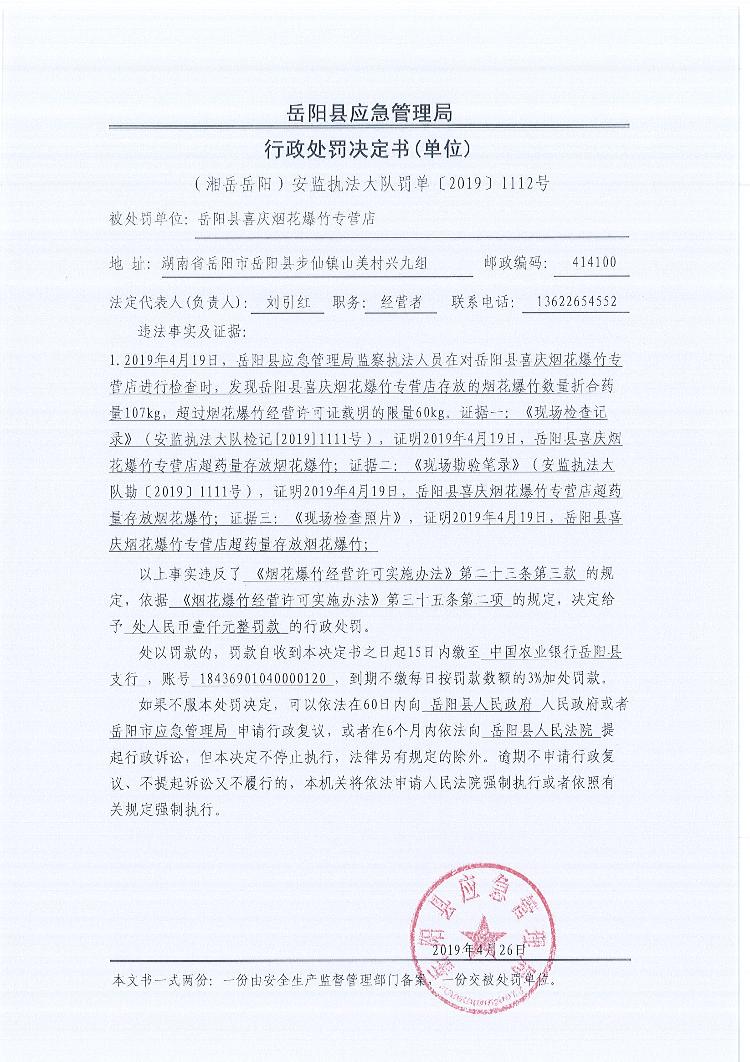 行政處罰決定書(湘嶽嶽陽安監執法大隊罰單〔2019 〕1112號)