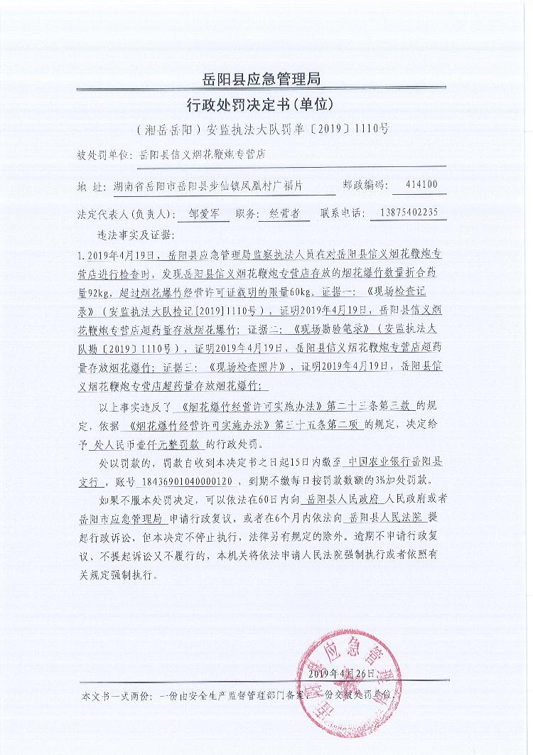 行政處罰決定書(湘嶽嶽陽安監執法大隊罰單〔2019 〕1110號)