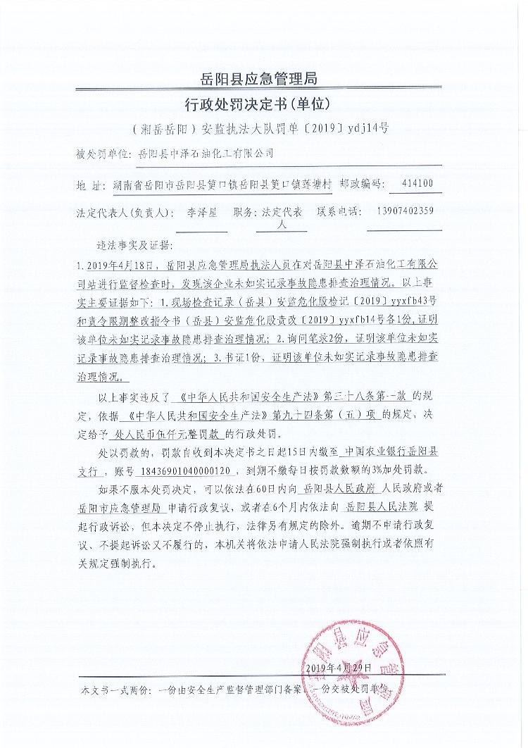行政處罰決定書(湘嶽嶽陽安監執法大隊罰單〔2019 〕ydj14號)