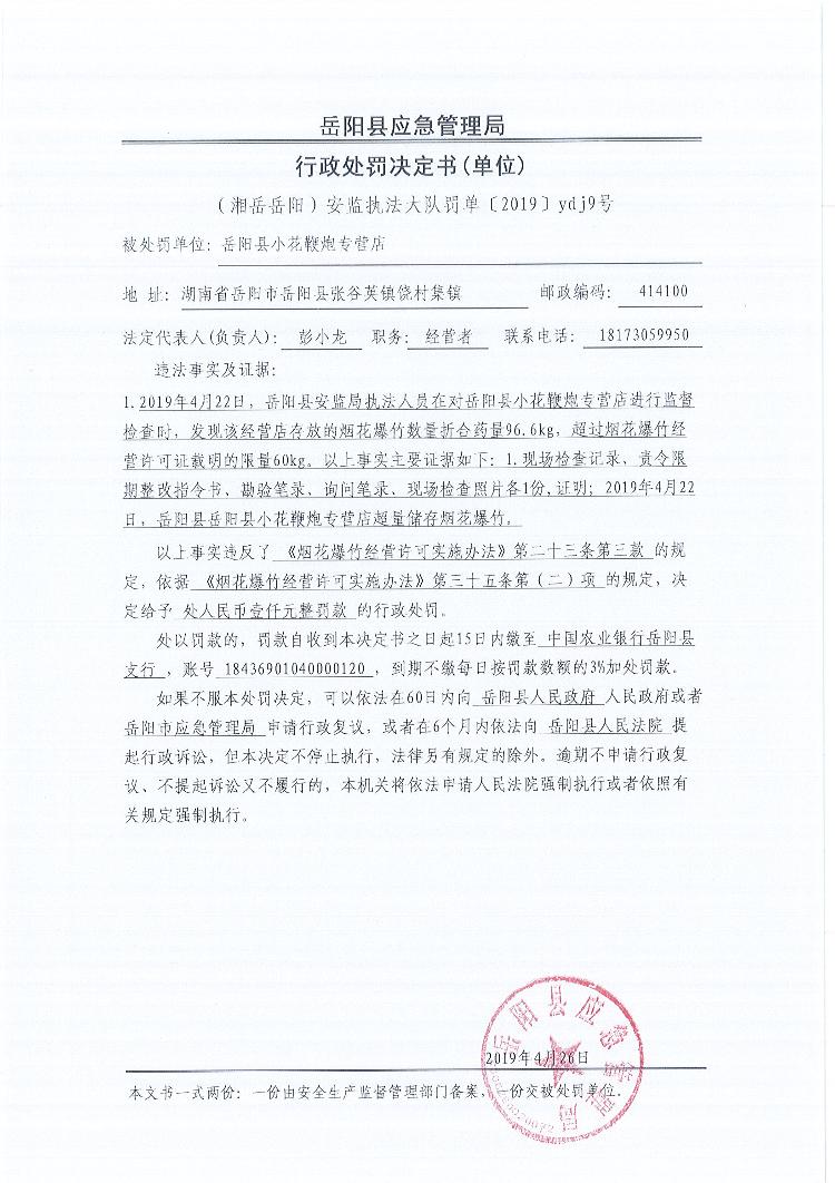 行政處罰決定書(湘嶽嶽陽安監執法大隊罰單〔2019 〕ydj9號)