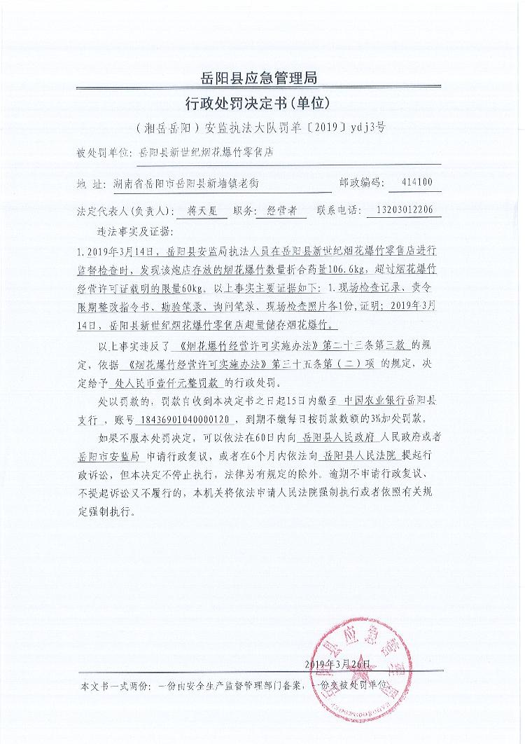 行政處罰決定書(湘嶽嶽陽安監執法大隊罰單〔2019 〕ydj3號)