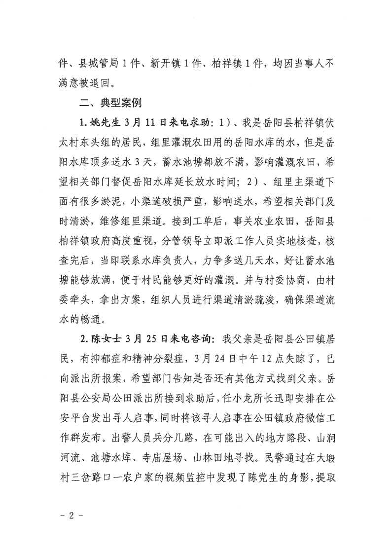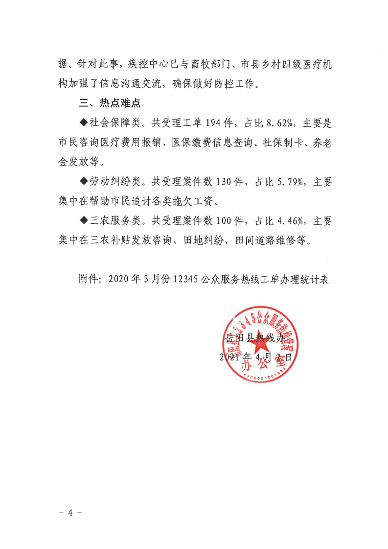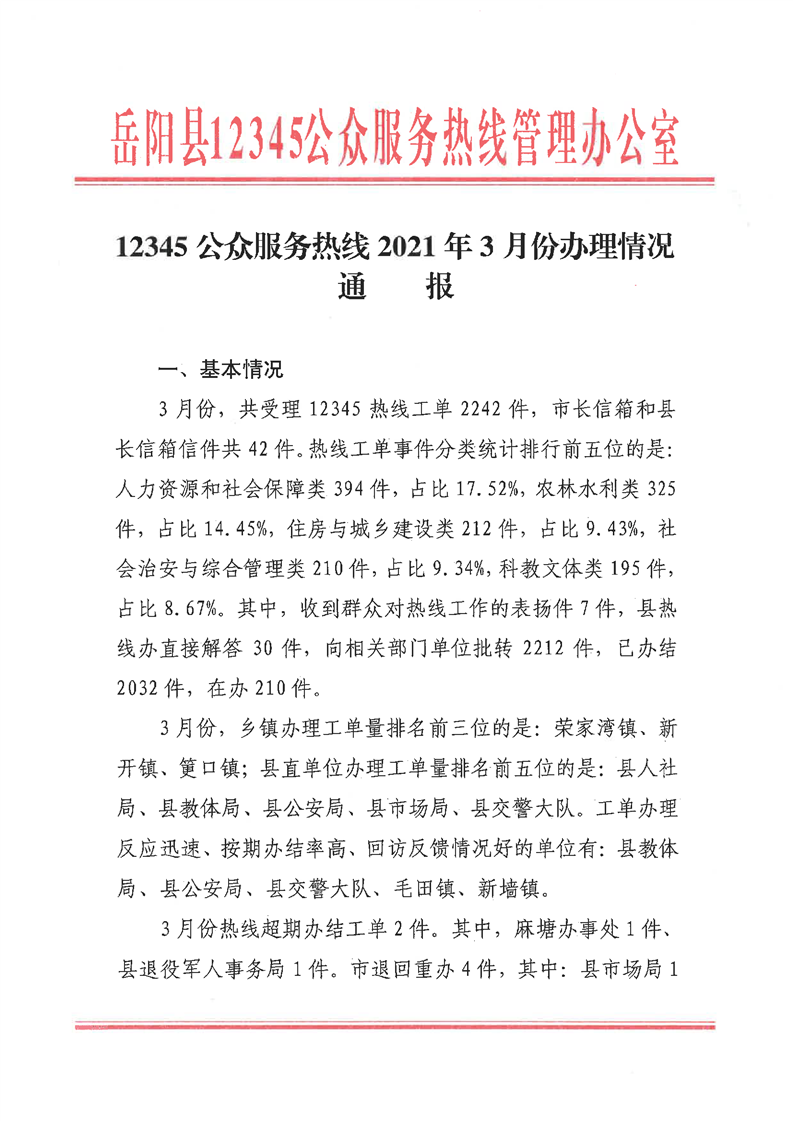 嶽陽縣12345公眾服務熱線2021年3月辦理情況通報