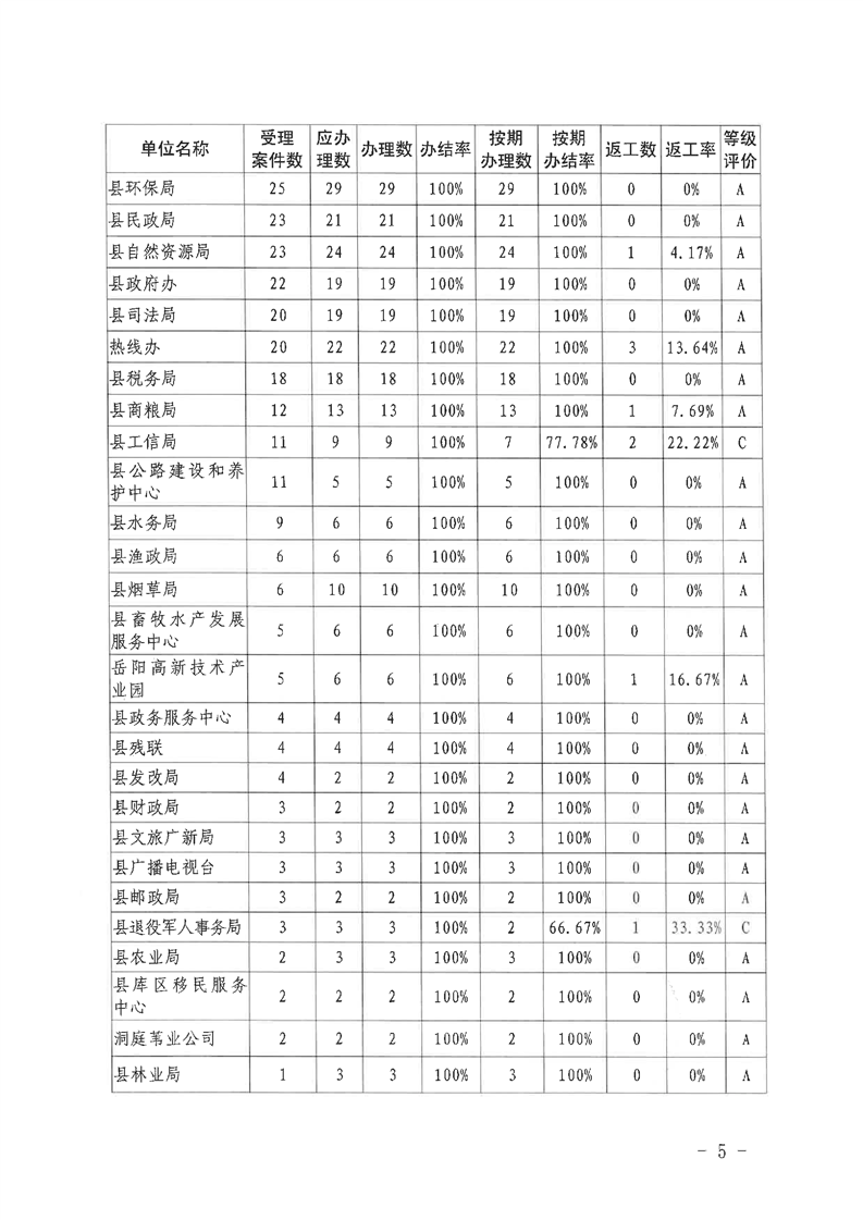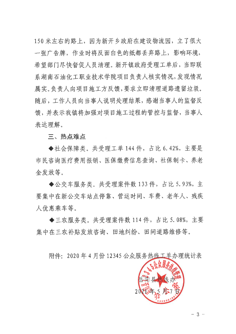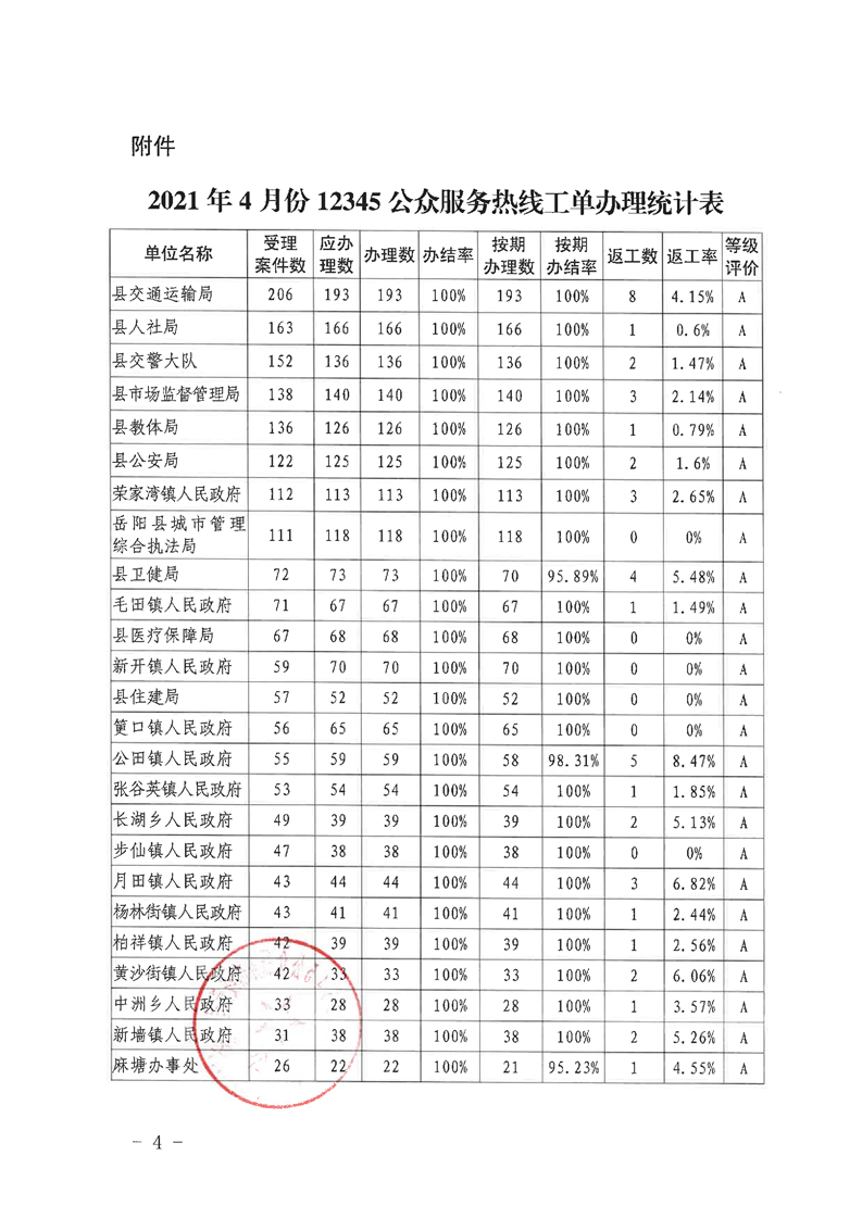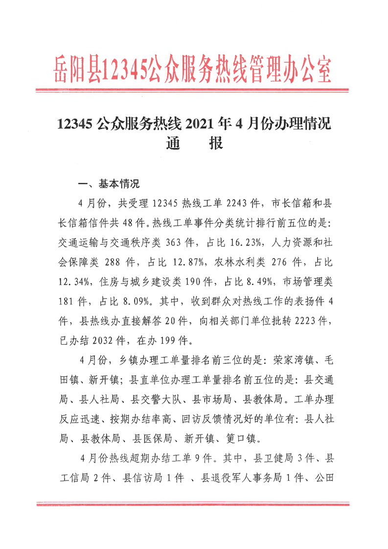 嶽陽縣12345公眾服務熱線2021年4月辦理情況通報