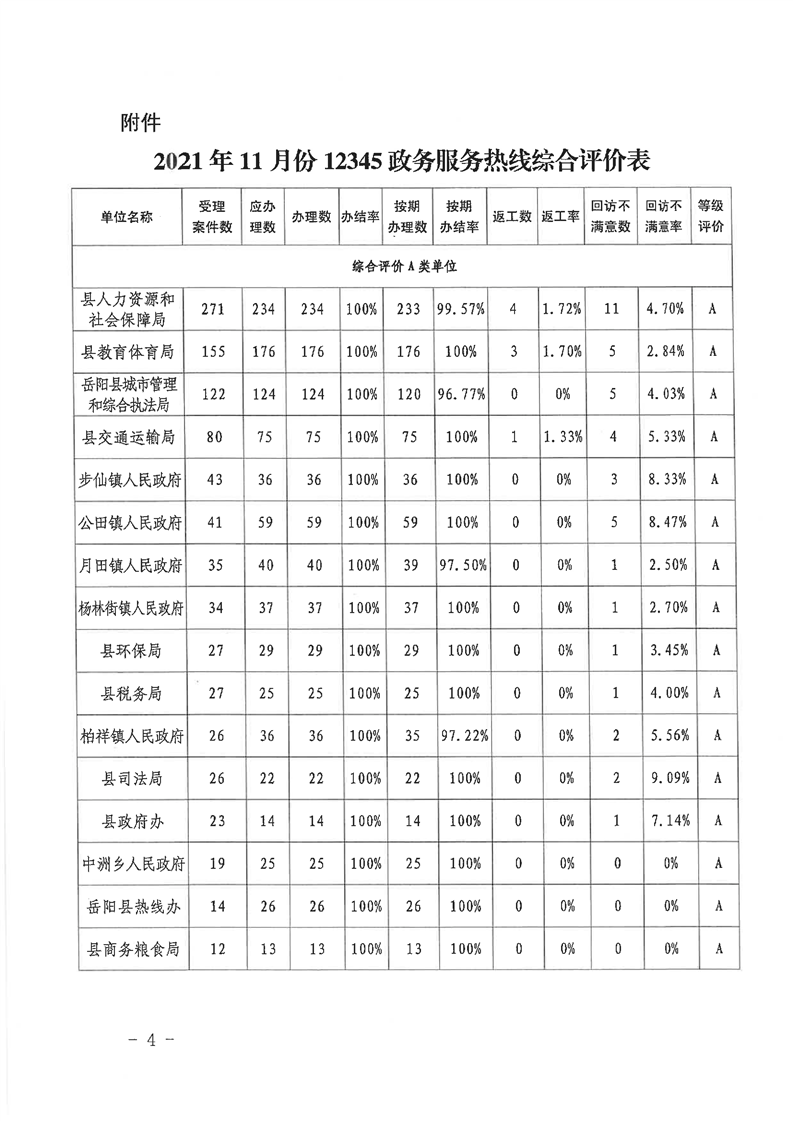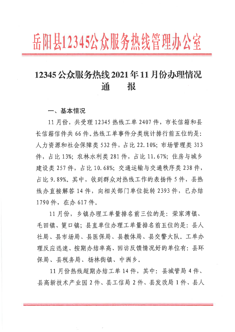 嶽陽縣12345公眾服務熱線2021年11月辦理情況通報