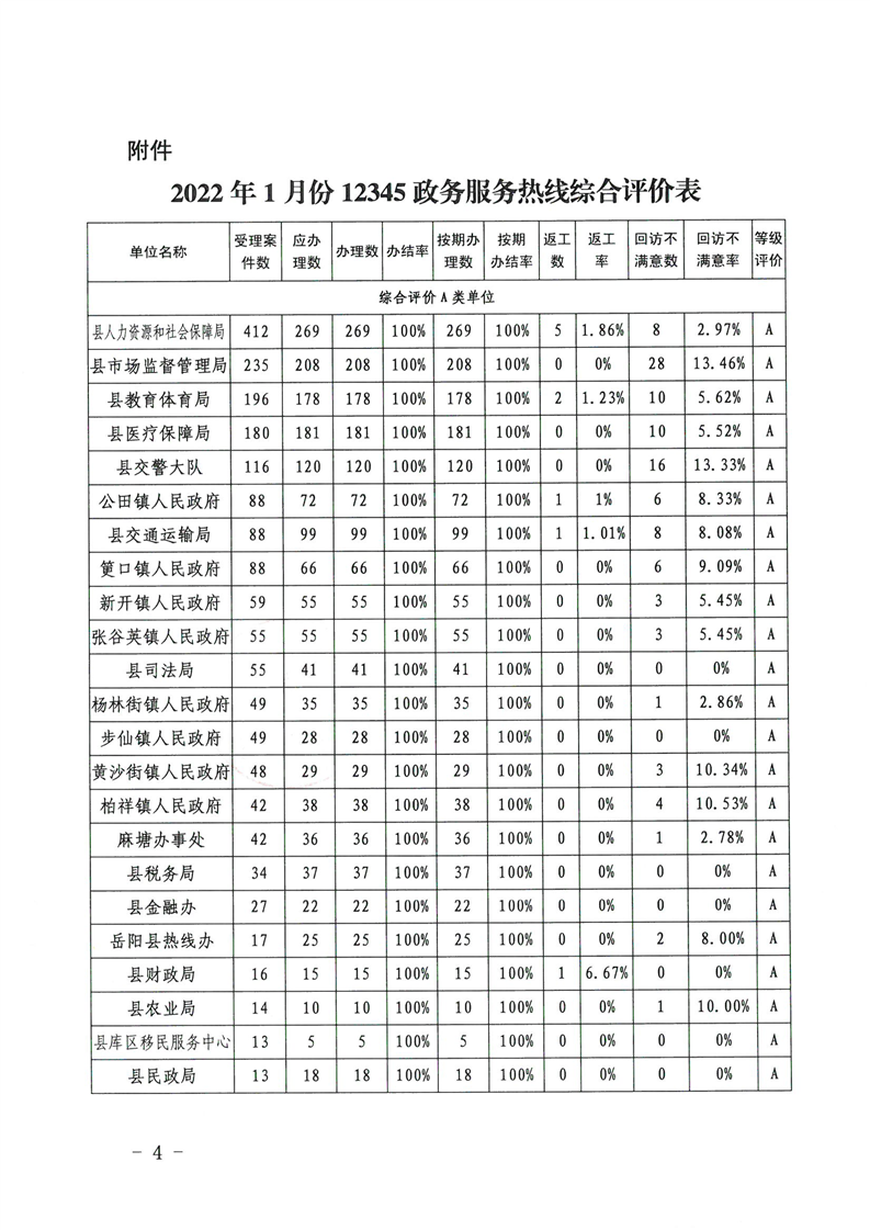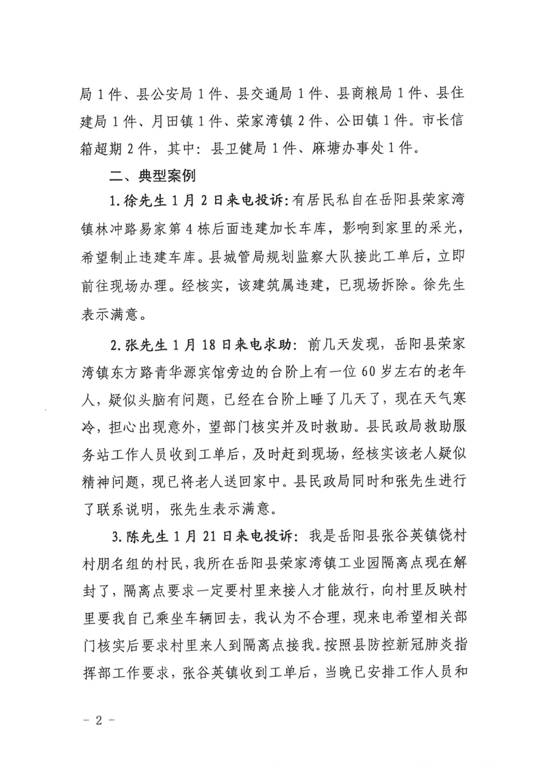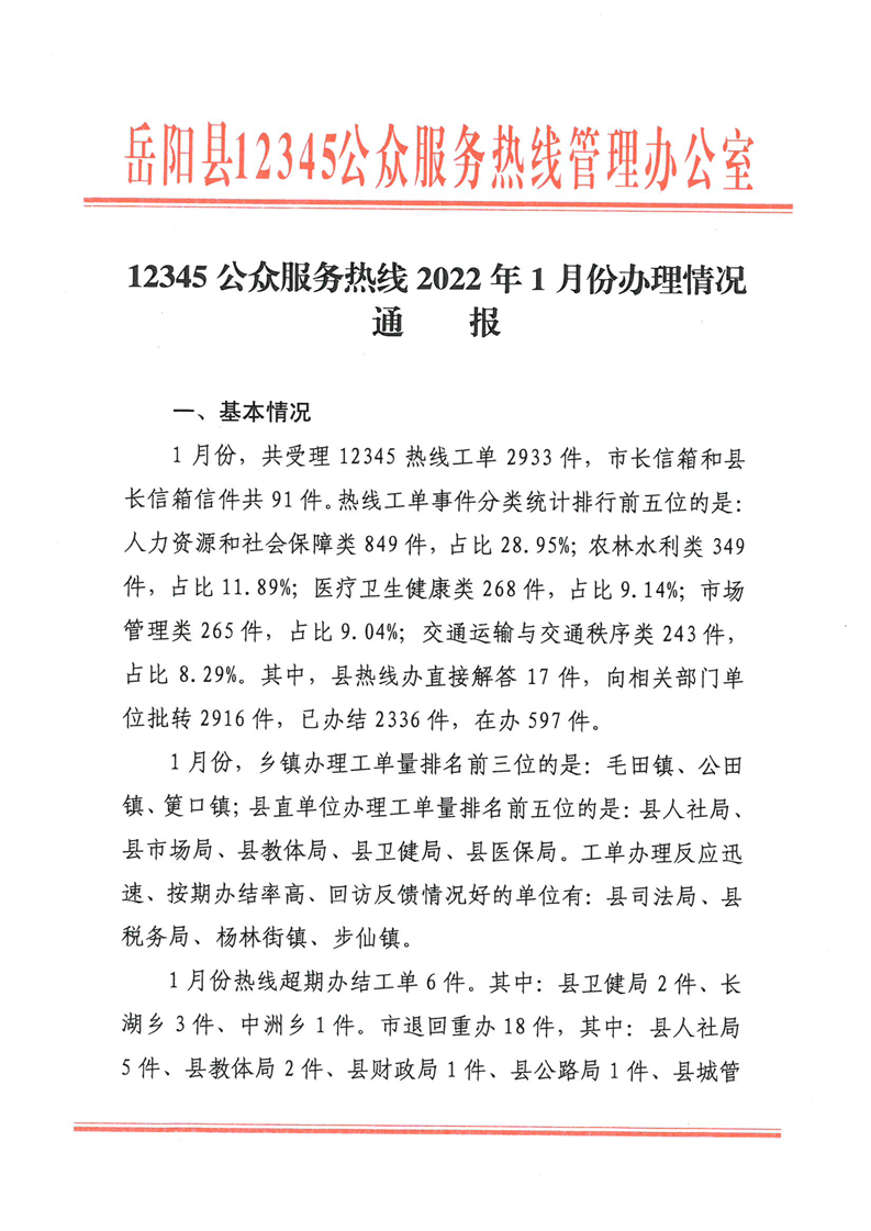 嶽陽縣12345公眾服務熱線2022年1月辦理情況通報