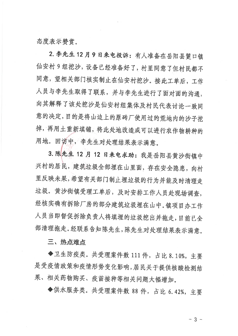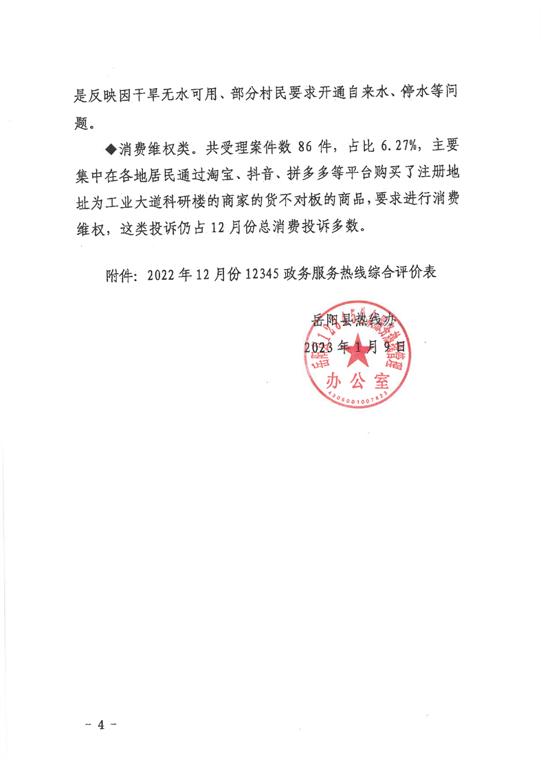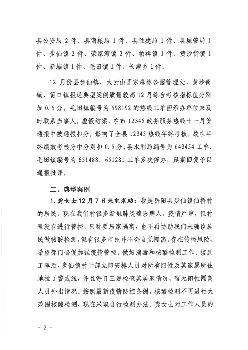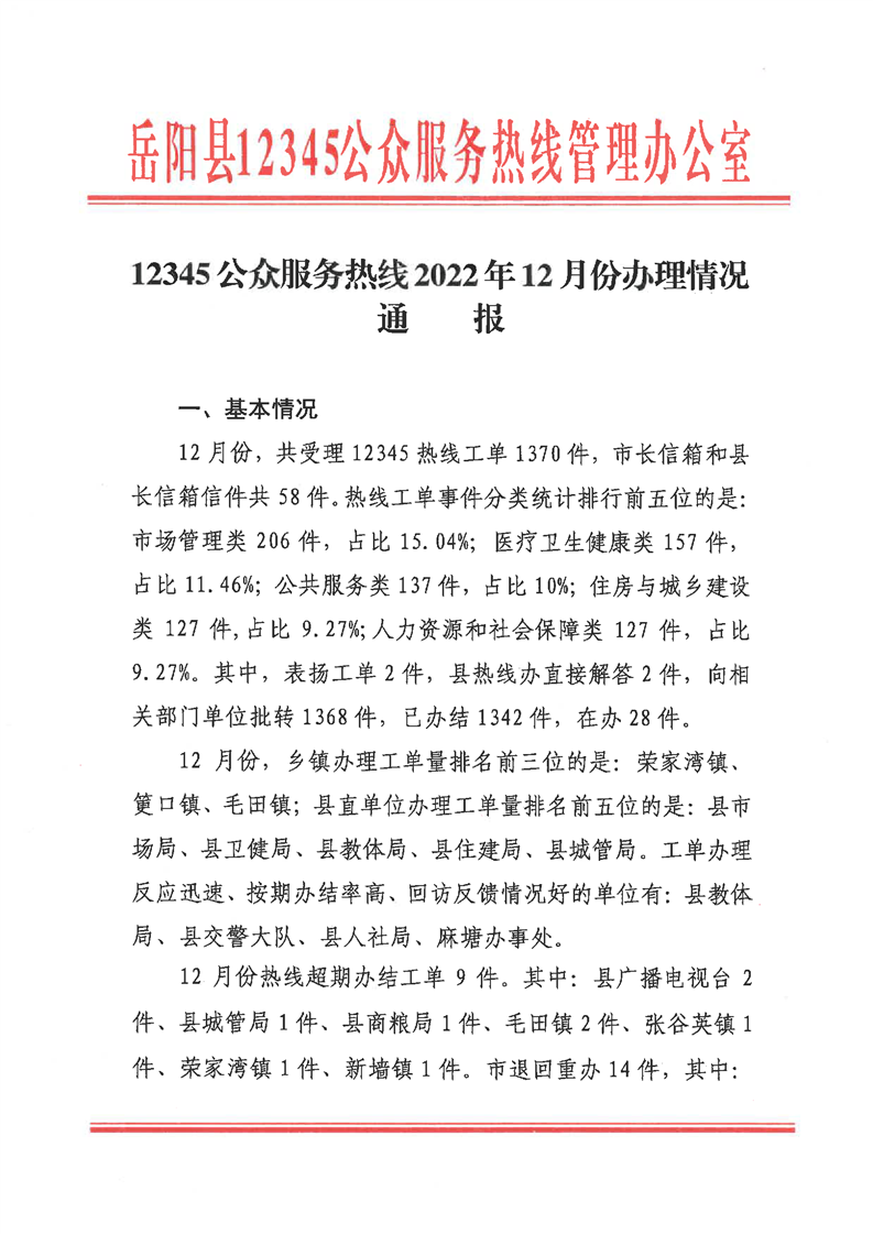 嶽陽縣12345公眾服務熱線2022年12月辦理情況通報