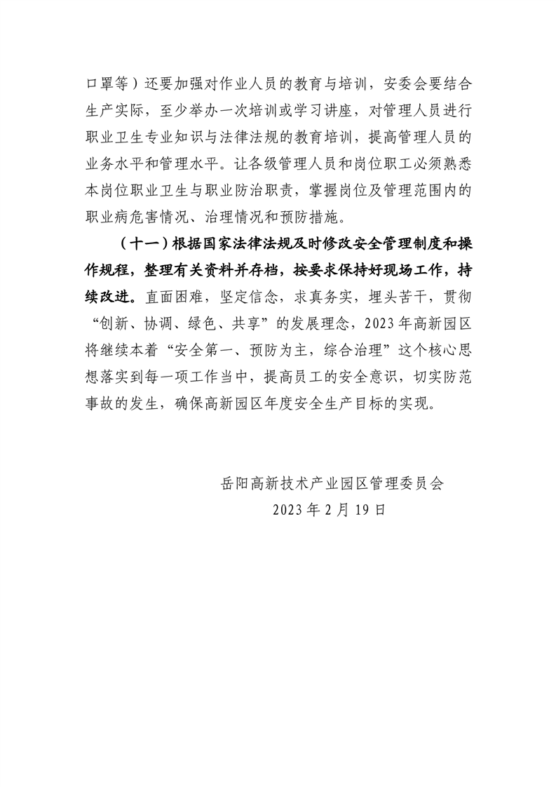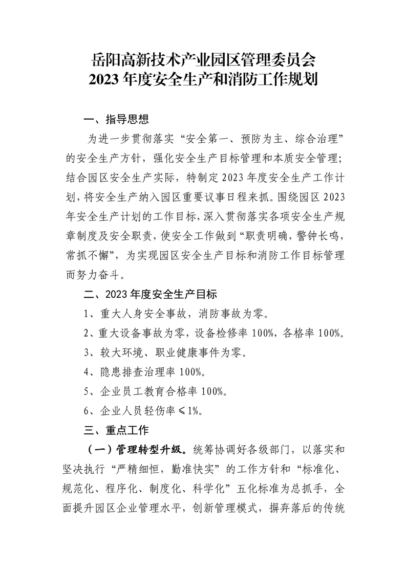 嶽陽高新技術產業園區管理委員會2023年度安全生產工作計劃