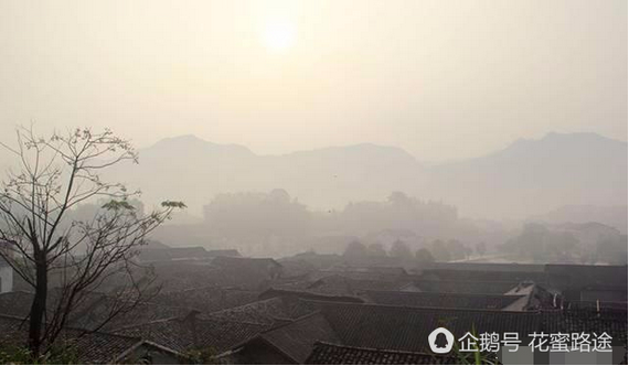 朦朧薄霧間,遠山、青磚黛瓦融為一體,儼然一副丹青水墨畫。