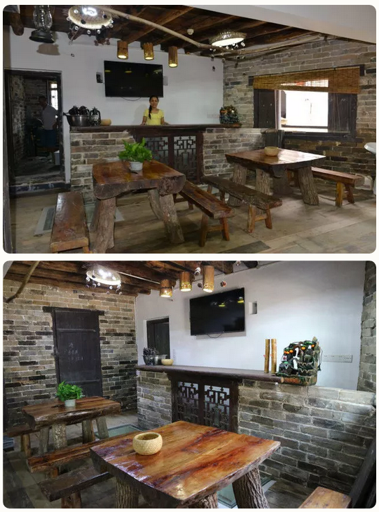 茶酒鋪的麵積不大,分為兩層,樓下是茶餐飲,樓上是住宿。因陋就簡,堂屋中擺放了兩大兩小四張木板桌、八個長條凳,鋥亮的桌麵散發著桐油清香,室內氣氛淡雅而溫馨。