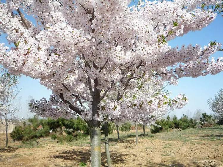 花期3月中旬,單瓣花,淡粉紅色,4~5朵花形成總狀花序,萼片及花梗上有毛。樹形高大,可達10~15米。小花柄、萼筒、萼片上有很多細毛,萼筒上部比較細,花蕾是粉紅色,在葉子長出前就盛開略帶淡紅色的白花,給人十分華麗的印象