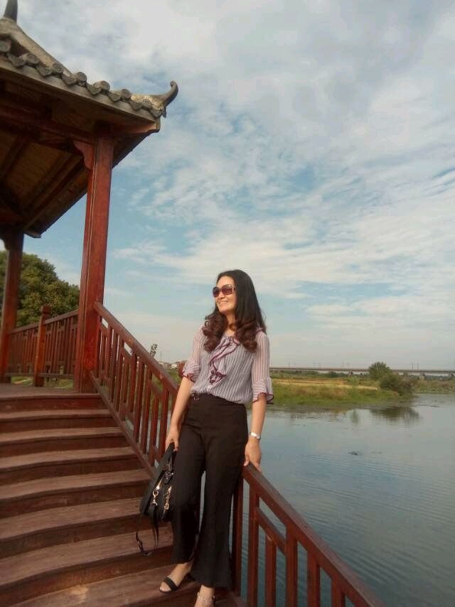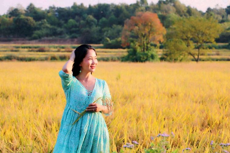 秋高氣爽,遊人站在園裏木製的小橋上,江南秋天的田園風光盡收眼底。蔚藍的天空中掛著淡淡的雲彩,金色的稻田一望無際,清澈的小溪流向遠方。近處的水塘裏波光粼粼,有幾隻小船在遊蕩,船上麵的人在采菱角,池塘邊還有幾個人在悠閑地釣魚。