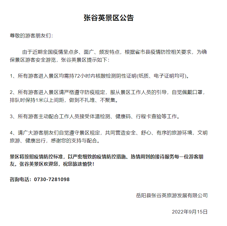 關於張穀英景區入園相關要求的公告