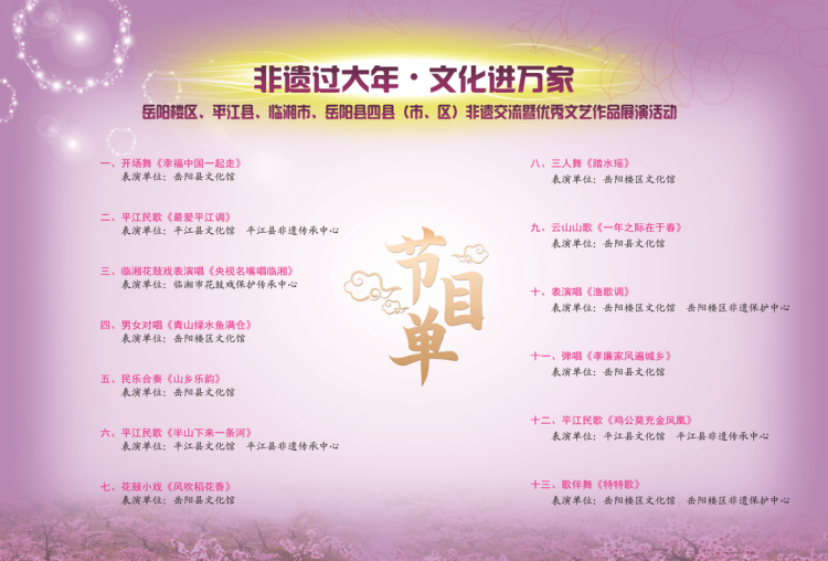 “非遺過大年·文化進萬家”2023年嶽陽樓區、平江縣、臨湘市、嶽陽縣四縣(市、區)非遺交流暨優秀文藝作品展演活動,活動時間:1月5日 下午14:30分,活動地點:嶽陽縣花鼓戲傳承劇院。