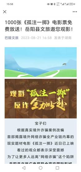 據悉,首部揭露境外網絡詐騙全產業鏈內幕的現實題材電影《孤注一擲》,根據真實境外詐騙案例改編,看過的觀眾都表示深受震撼。為了讓更多人遠離“電信網絡詐騙”這個陷阱,嶽陽縣文旅廣電局推出《孤注一擲》免費觀影,活動期間,市民朋友隻需將活動推文轉發至個人朋友圈,在影城向工作人員出示轉發本文集讚及下載“國家反詐中心”APP頁麵憑證,就能兌換領取總計1000張觀影券,在電影上映期間,可憑觀影券兌換電影票入場。