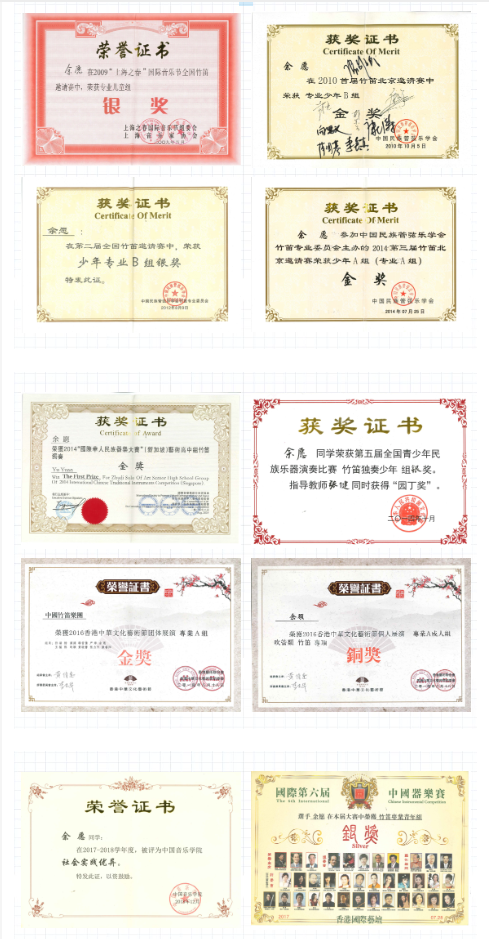 2009年5月榮獲“上海之春”國際音樂節全國竹笛邀請賽專業兒童組銀獎;2010年10月榮獲首屆竹笛北京邀請賽專業少年B組金獎;2012年8月榮獲第二屆全國竹笛邀請賽專業少年組銀獎;2014年7月榮獲第三屆全國竹笛邀請賽專業少年A組金獎;2014年8月榮獲國際華人民族器樂大賽專業組竹笛獨奏金獎;2014年10月榮獲文華藝術院校獎——第五屆全國青少年民族器樂演奏比賽少年組竹笛專業銀獎;2015年榮獲第二屆中國西南地區笛簫獨奏展演暨玉屏竹笛邀請賽青年組(九大院校)銅獎;2016年榮獲香港中華文化藝術節團體展演竹笛專業A組金獎;2017年獲第六屆國際中國器樂賽(九大院校)專業青年組銀獎;2017—2021年在中國音樂學院開展了4場個人竹笛演奏專場音樂會。