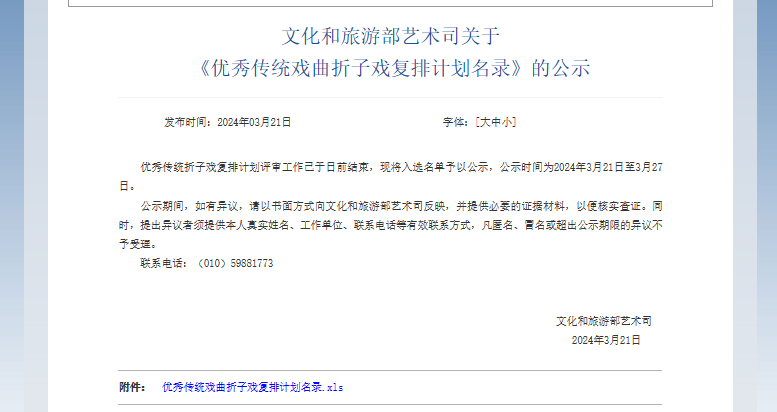 為深入學習貫徹習近平文化思想,挖掘推出更多承載優秀傳統文化的戲曲折子戲,文化和旅遊部於2023年至2025年實施優秀傳統戲曲折子戲複排計劃,該計劃是落實《2023-2025舞台藝術創作行動計劃》“組織複排優秀傳統戲曲'折子戲’300個左右”的行動目標的重要舉措。