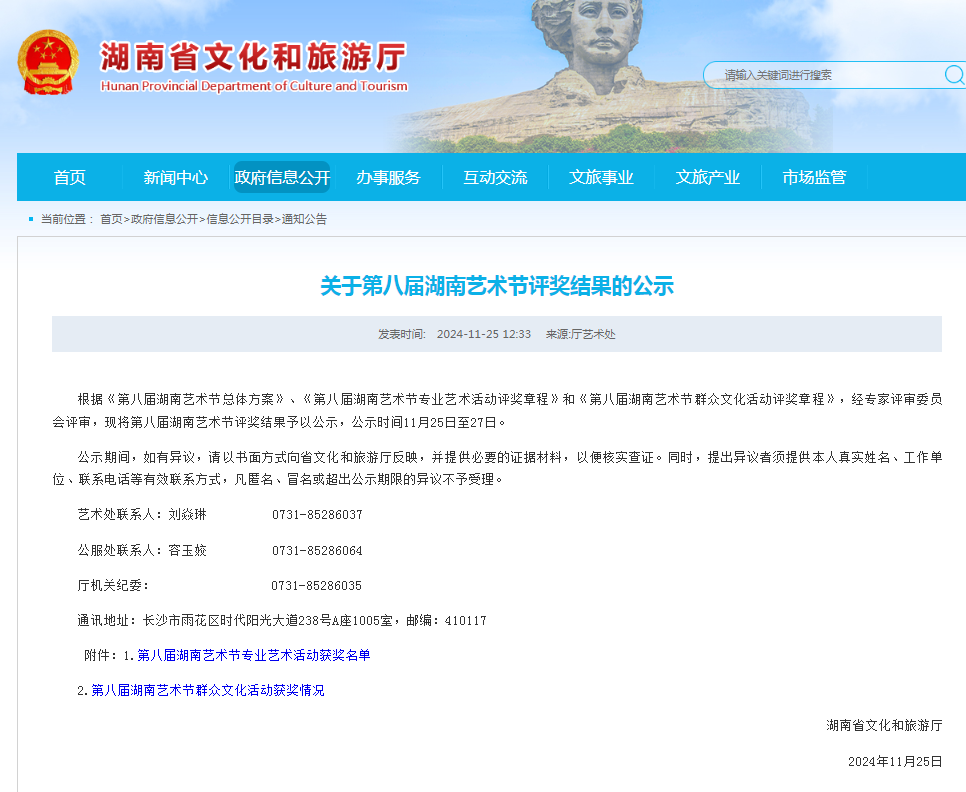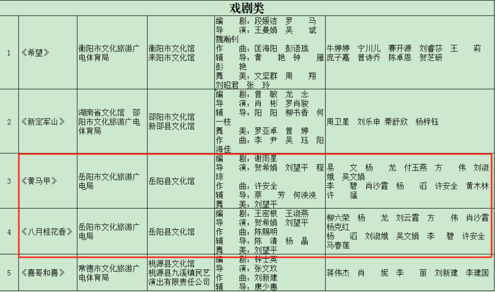 11月25日,第八屆湖南藝術節評獎結果公示,嶽陽縣文化館參賽作品花鼓小戲《黃馬甲》和《八月桂花香》榮獲第八屆湖南藝術節群眾文化活動“三湘群星獎”最佳作品獎;新創花鼓小戲《回家》榮獲專業藝術活動田漢小劇目獎。