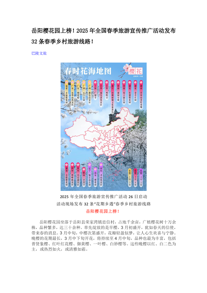 嶽陽櫻花園上榜!2025年全國春季旅遊宣傳推廣活動發布32條春季鄉村旅遊線路!