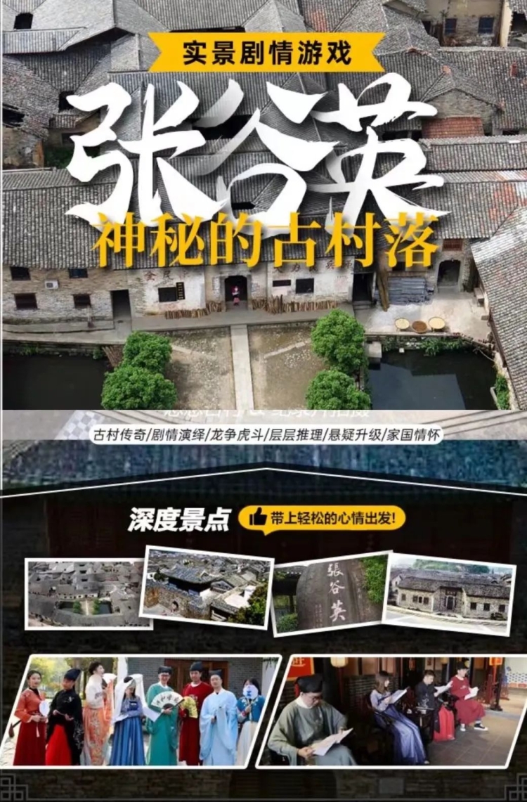 近年來,劇本殺的形式不僅僅局限於桌遊,開始演變為沉浸式體驗。“景區+劇本殺”是一種新的文旅模式,更是受到遊客,特別是 年輕人的喜愛。張穀英景區在這種浪潮之下,與劇遊神州跨界合作《探秘古村落》沉浸式劇本殺,豐富景區業態。
