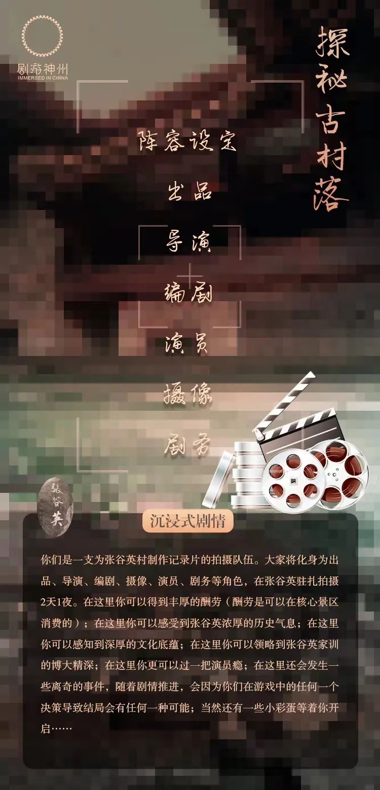 以張穀英村紀錄片生產的過程為劇情背景,提供了出品方、導演、編劇、演員、攝像、劇務等陣營,每個陣營當中涵蓋不同心思和性格特征的角色,可靈活容納不同數量的玩家同時參與體驗。