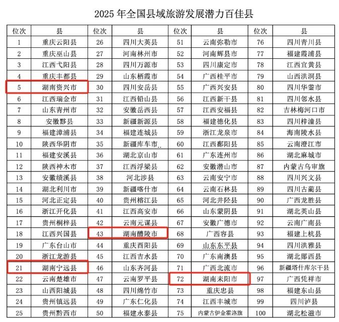 在旅遊發展潛力百佳縣榜單中,資興市高居全國第五,寧遠縣、醴陵市、耒陽市也成功入選。這些縣域不僅坐擁優質旅遊資源,更在文旅融合方麵表現突出。