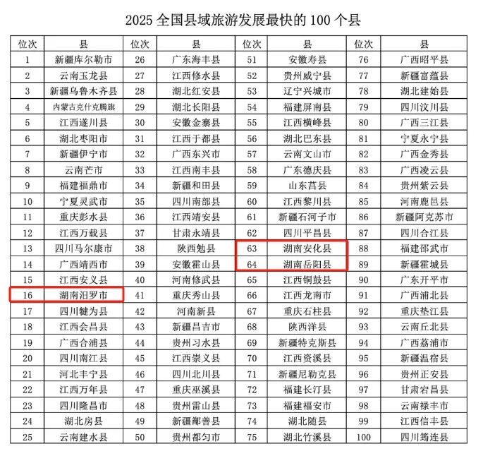 汨羅市、安化縣、嶽陽縣入選“全國縣域旅遊發展最快百強縣”,分別排名第16、63、64位。