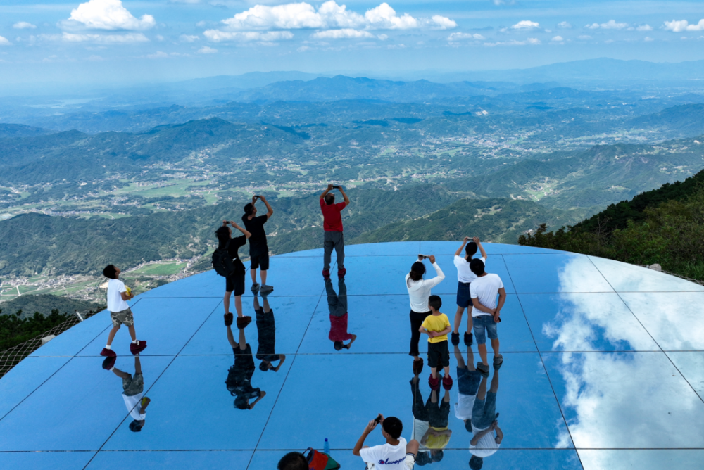 天嶽幕阜山景區,遊客在“天嶽之光”鏡麵平台景點打卡拍照。 湖南日報全媒體記者 徐典波 攝