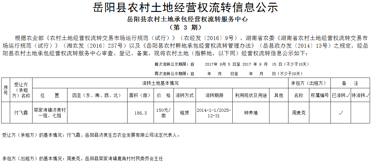 嶽陽縣農村土地經營權流轉信息公示(第3期)