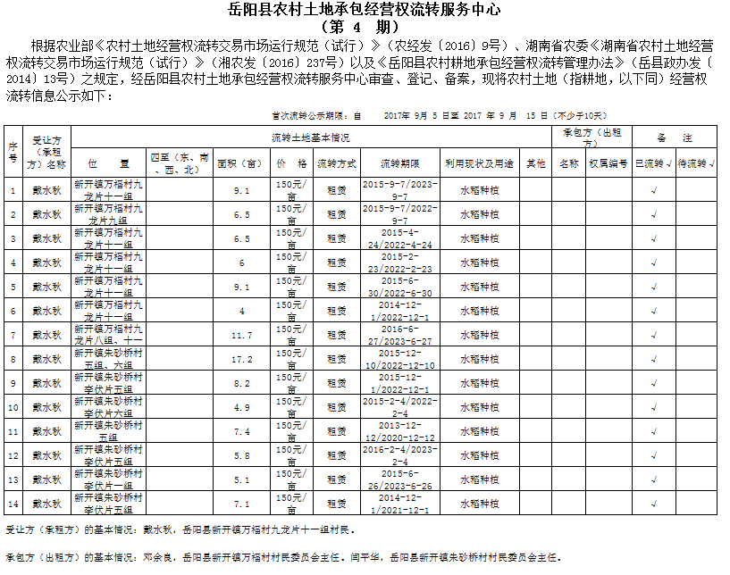 嶽陽縣農村土地經營權流轉信息公示(第4期)