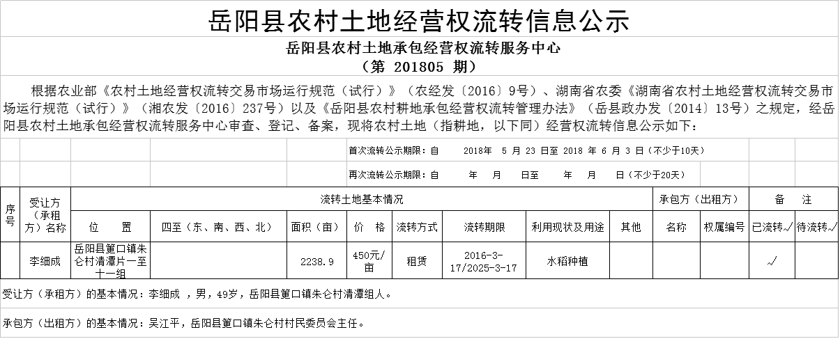 嶽陽縣農村土地經營權流轉信息公示(第201805期)