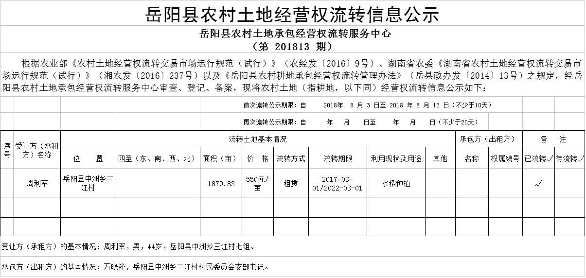 嶽陽縣農村土地經營權流轉信息公示 (第 201813 期)