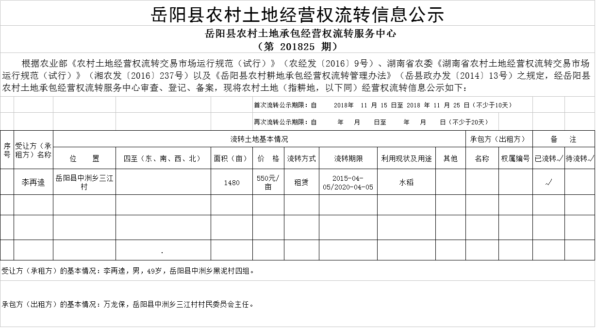 嶽陽縣農村土地經營權流轉信息公示 (第 201825 期)