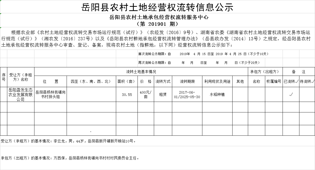 嶽陽縣農村土地經營權流轉信息公示 (第 201901 期)