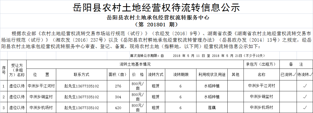 嶽陽縣農村土地經營權待流轉信息公示(第201801期)