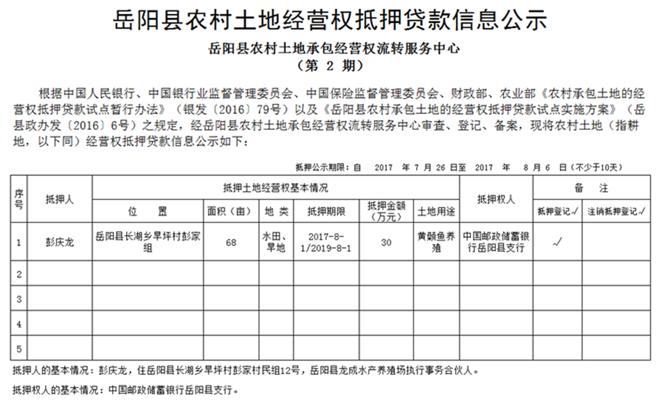 嶽陽縣農村土地經營權抵押貸款信息公示(第2期)
