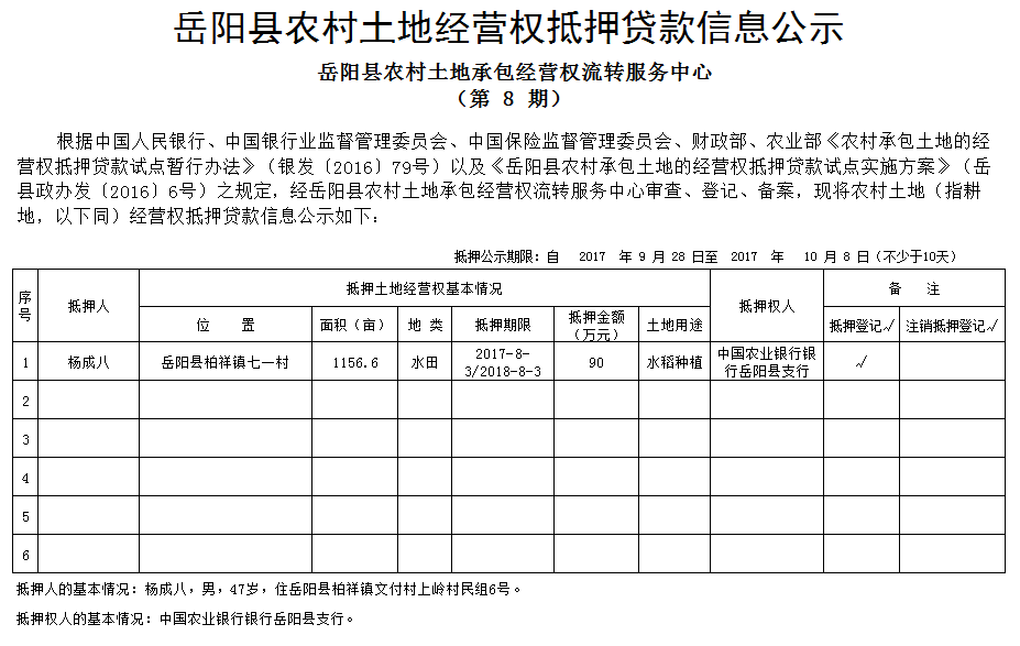 嶽陽縣農村土地經營權抵押貸款信息公示(第8期)