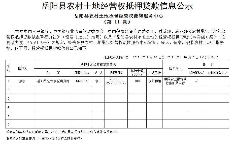 嶽陽縣農村土地經營權抵押貸款信息公示(第11期)