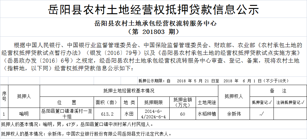 嶽陽縣農村土地承包經營權抵押貸款信息公示(第201803期)
