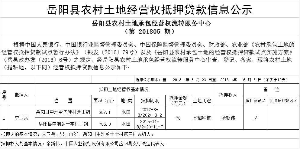 嶽陽縣農村土地經營權抵押貸款信息公示(第201805期)