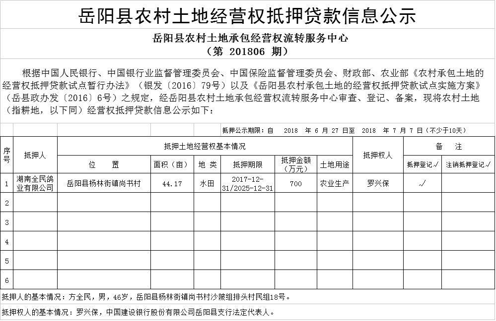 嶽陽縣農村土地經營權抵押貸款信息公示(第201806期)