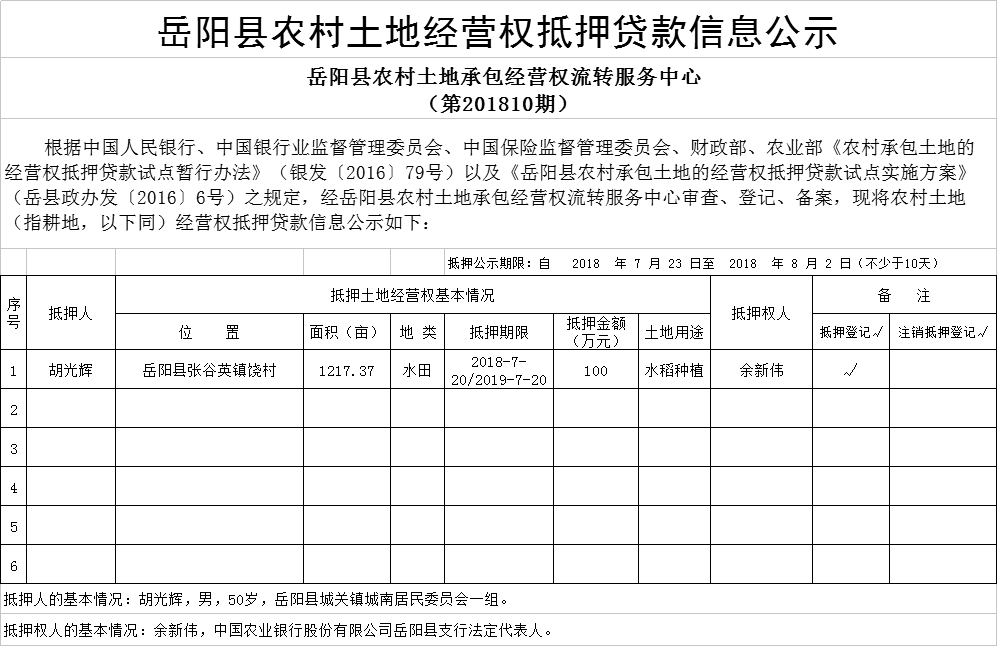 嶽陽縣農村土地經營權抵押貸款信息公示(第201810期)