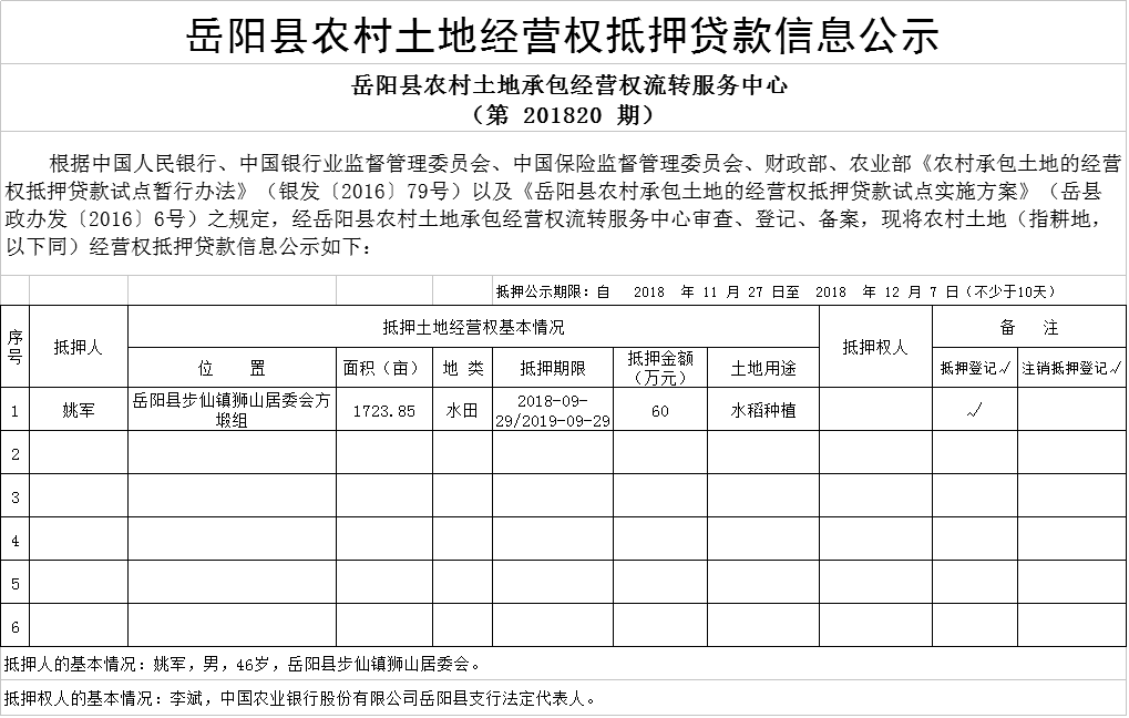 嶽陽縣農村土地經營權抵押貸款信息公示(第 201820 期)