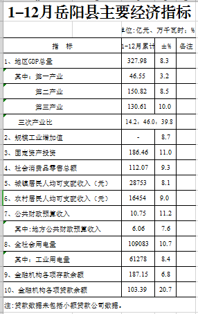 2018年1-12月嶽陽縣主要經濟指標