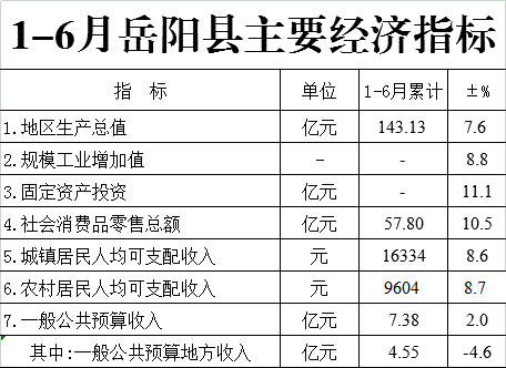 2019年1-6月嶽陽縣主要經濟指標