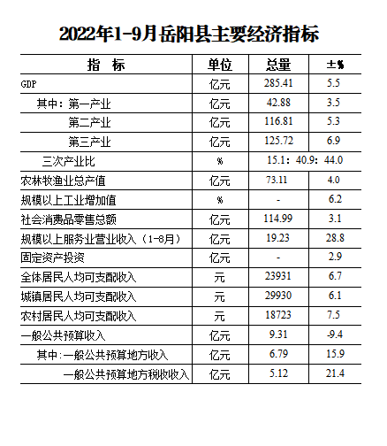 2022年1-9月嶽陽縣主要經濟指標