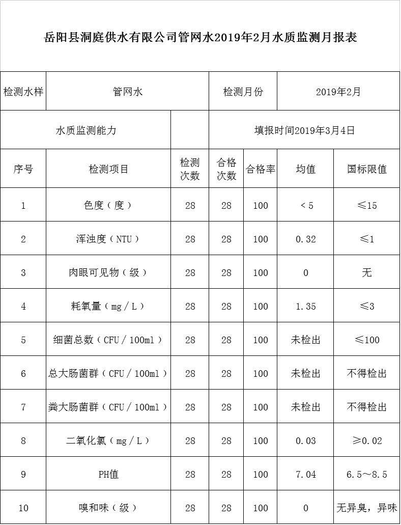 嶽陽縣洞庭供水有限公司管網水2019年2月水質監測月報表